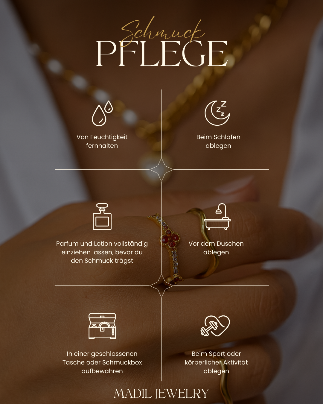 Unsere Schmuckstücke bestehen aus hochwertigem Edelstahl (18K vergoldet) , hochwertigem Kupfer oder 925 Sterling Silber – wasserfest & langlebig.