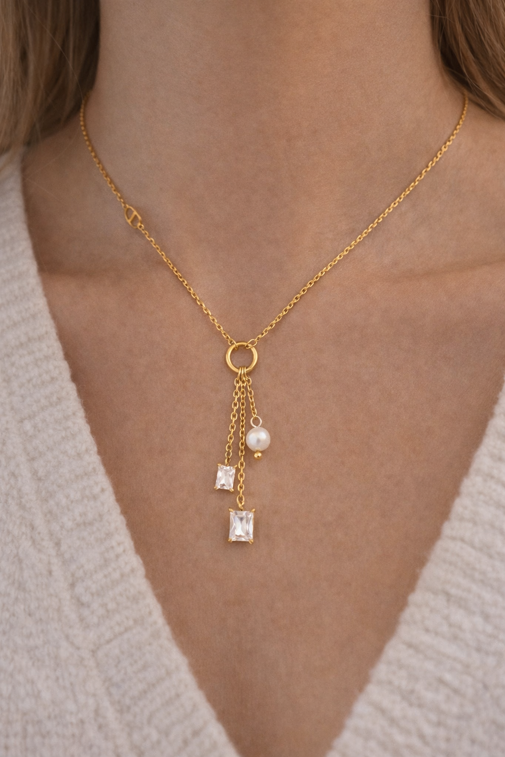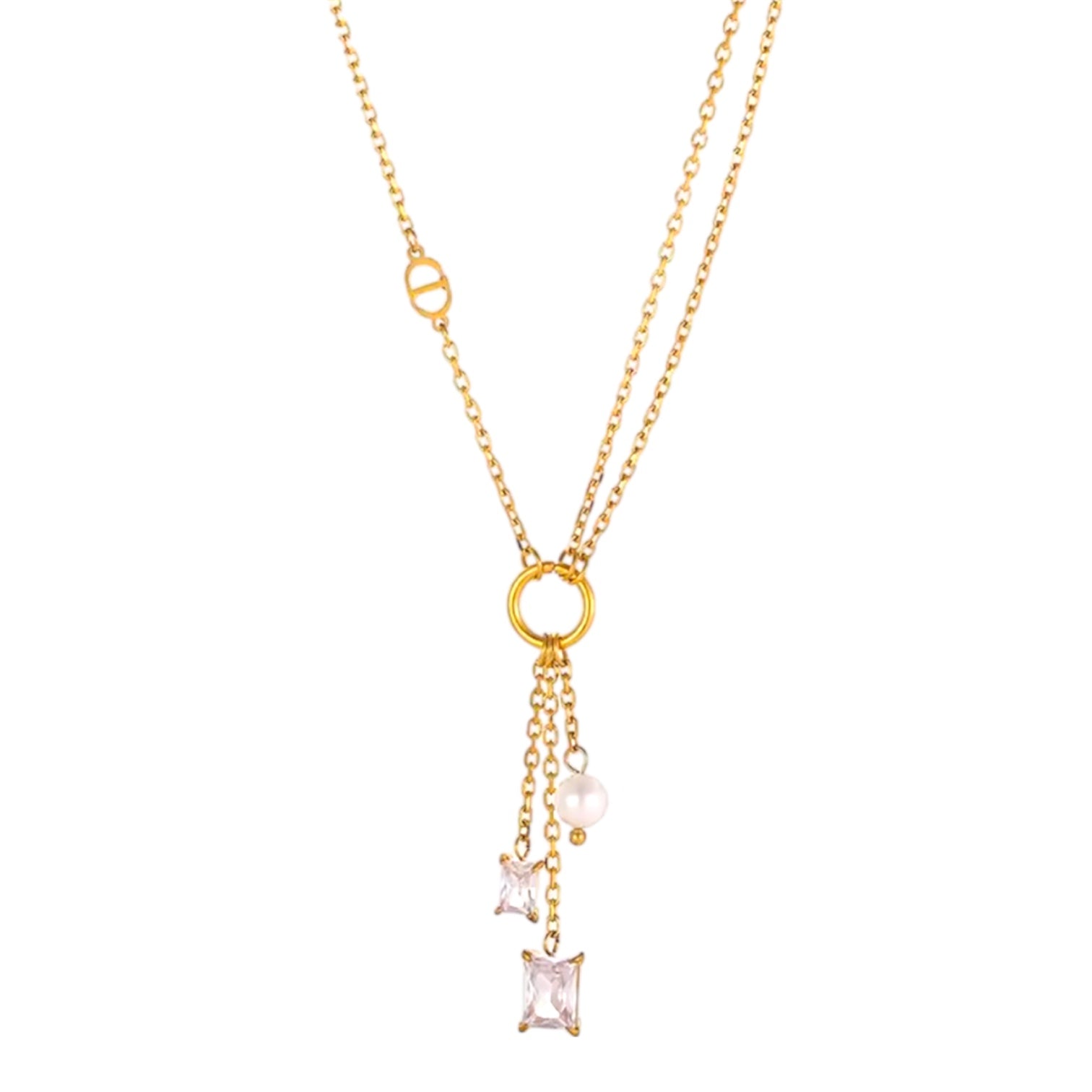 ✔️ Design: Zarte Doppelketten-Optik mit elegantem Ring-Anhänger und zwei funkelnden Zirkonia-Steinen im Tropfdesign