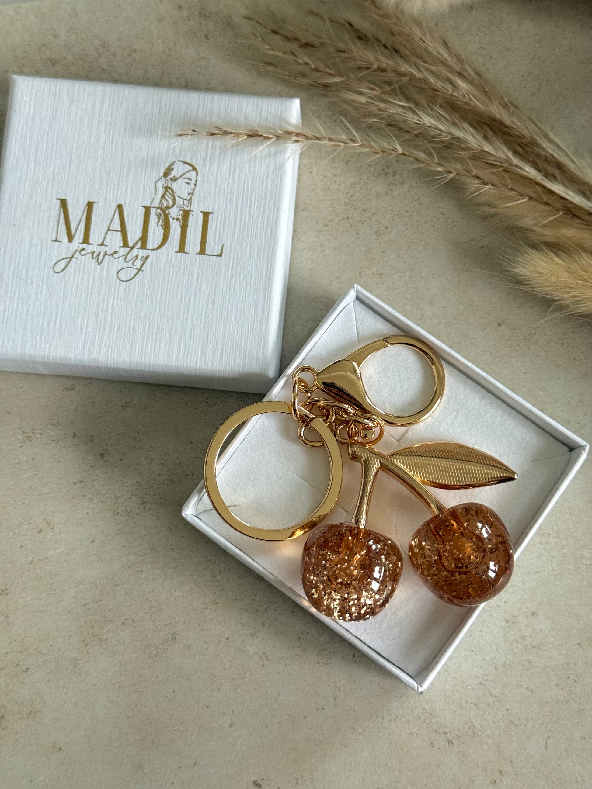 Das stilvolle Cherry Keychain ist ein Must-Have Accessoire für dich. Die funkelnden Acrylkirschen und goldenen Details verleihen deiner Tasche oder deinem Schlüsselbund einen Hauch von Verspieltheit und Eleganz. Mit feinen Glitzerpartikeln ist es das perfekte Highlight für einen besonderen Touch.