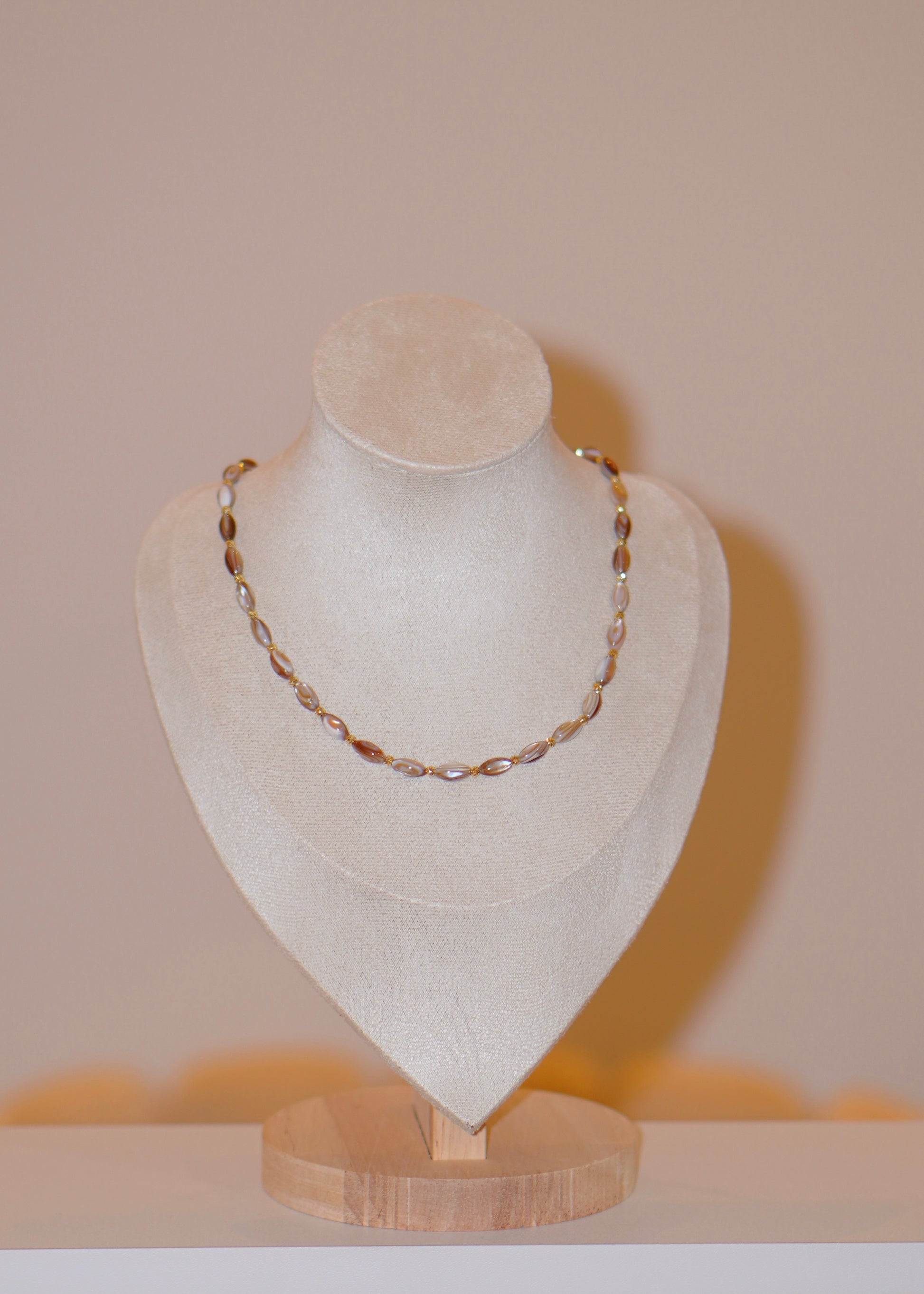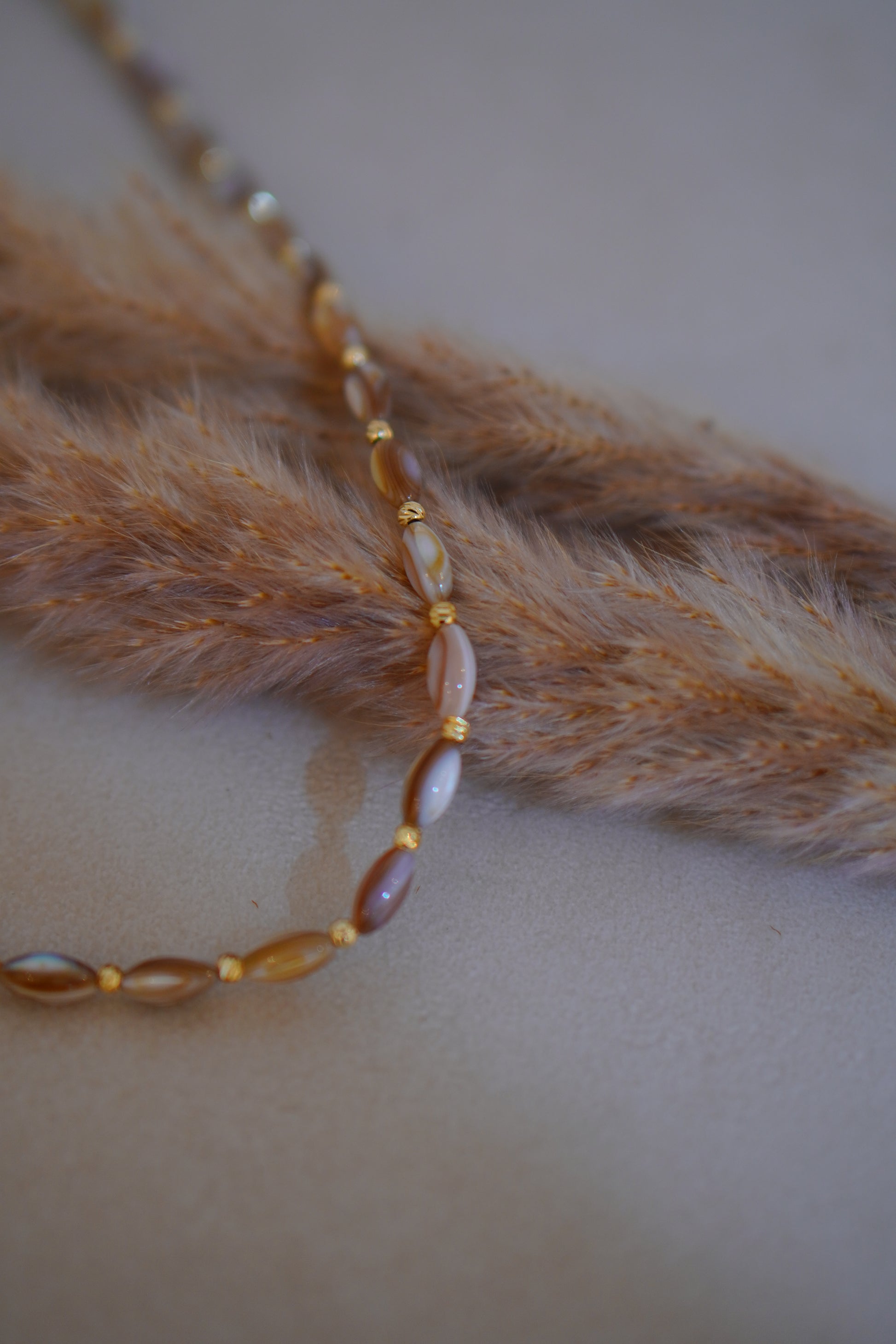 Diese Halskette besteht aus braunen ovalen und goldenen Perlen. Die harmonische Kombination aus braunen Steinem und goldfarbenen Perlen verleiht dem Schmuckstück eine zeitlose, elegante Ausstrahlung – perfekt für besondere Anlässe oder einen stilvollen Alltagslook.