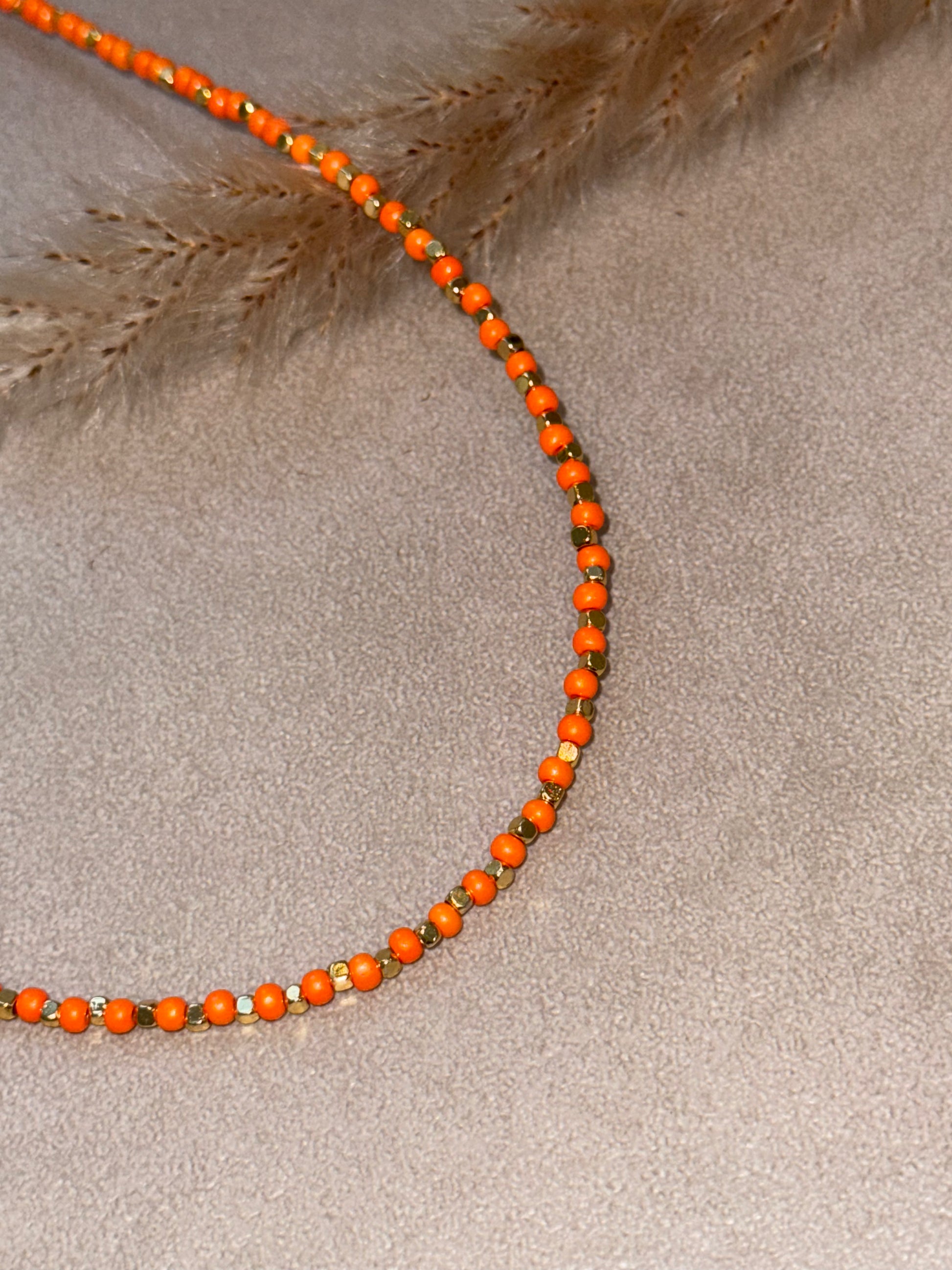 Leuchtend orangefarbene Halskette mit feinen Perlen – auffällig und modern.