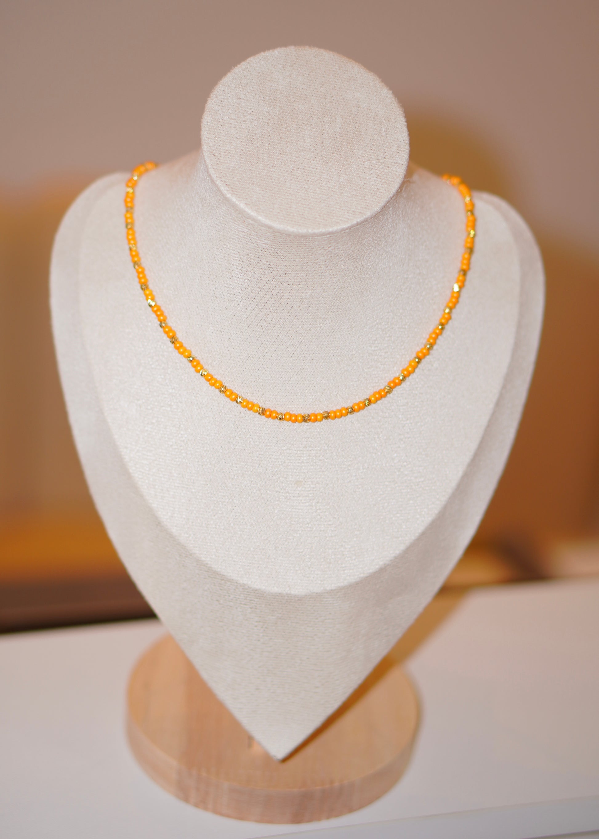 Leuchtende Halskette mit hellen orangen Perlen und goldenen Zwischenelementen – auffällig und modern.