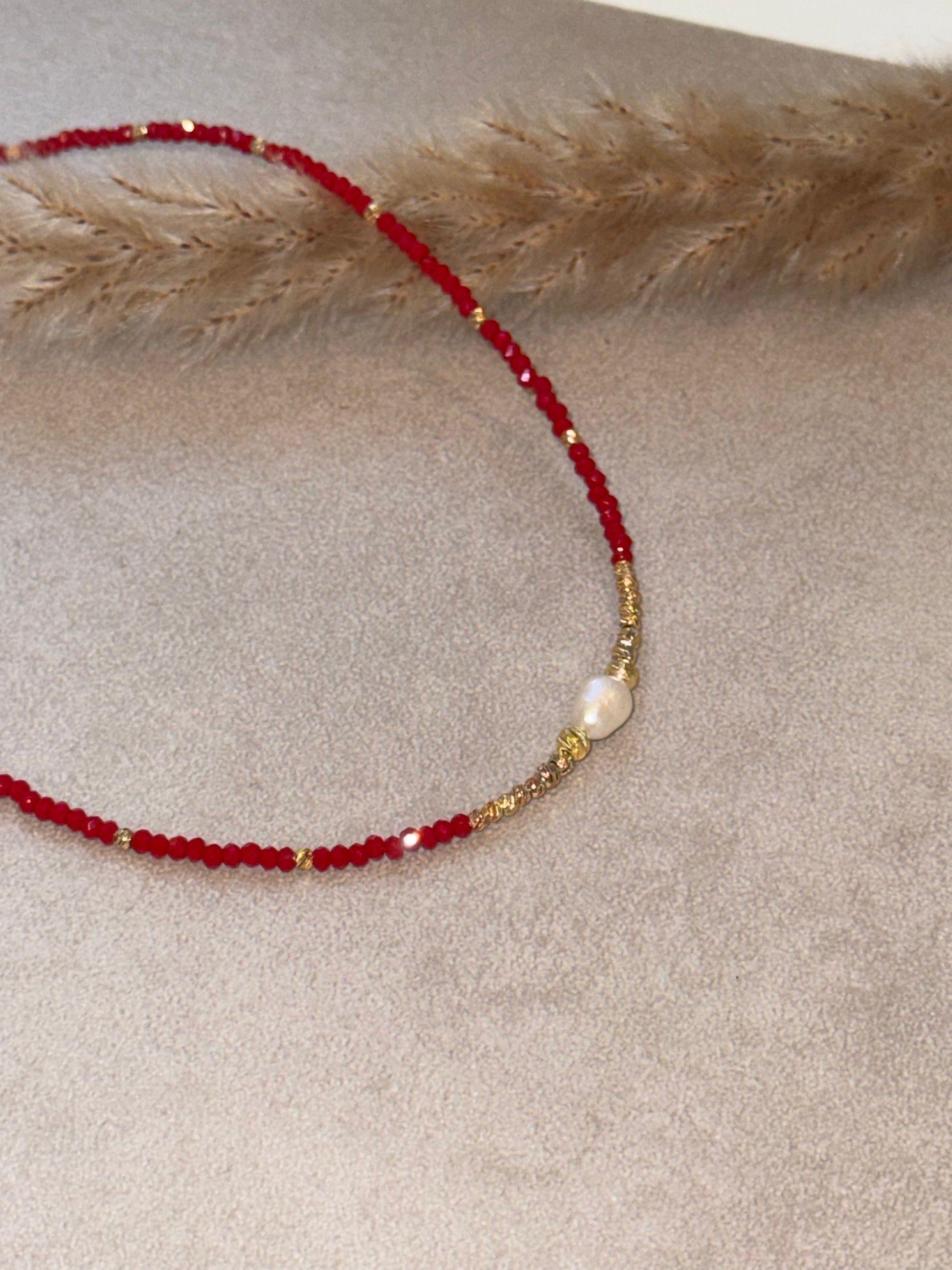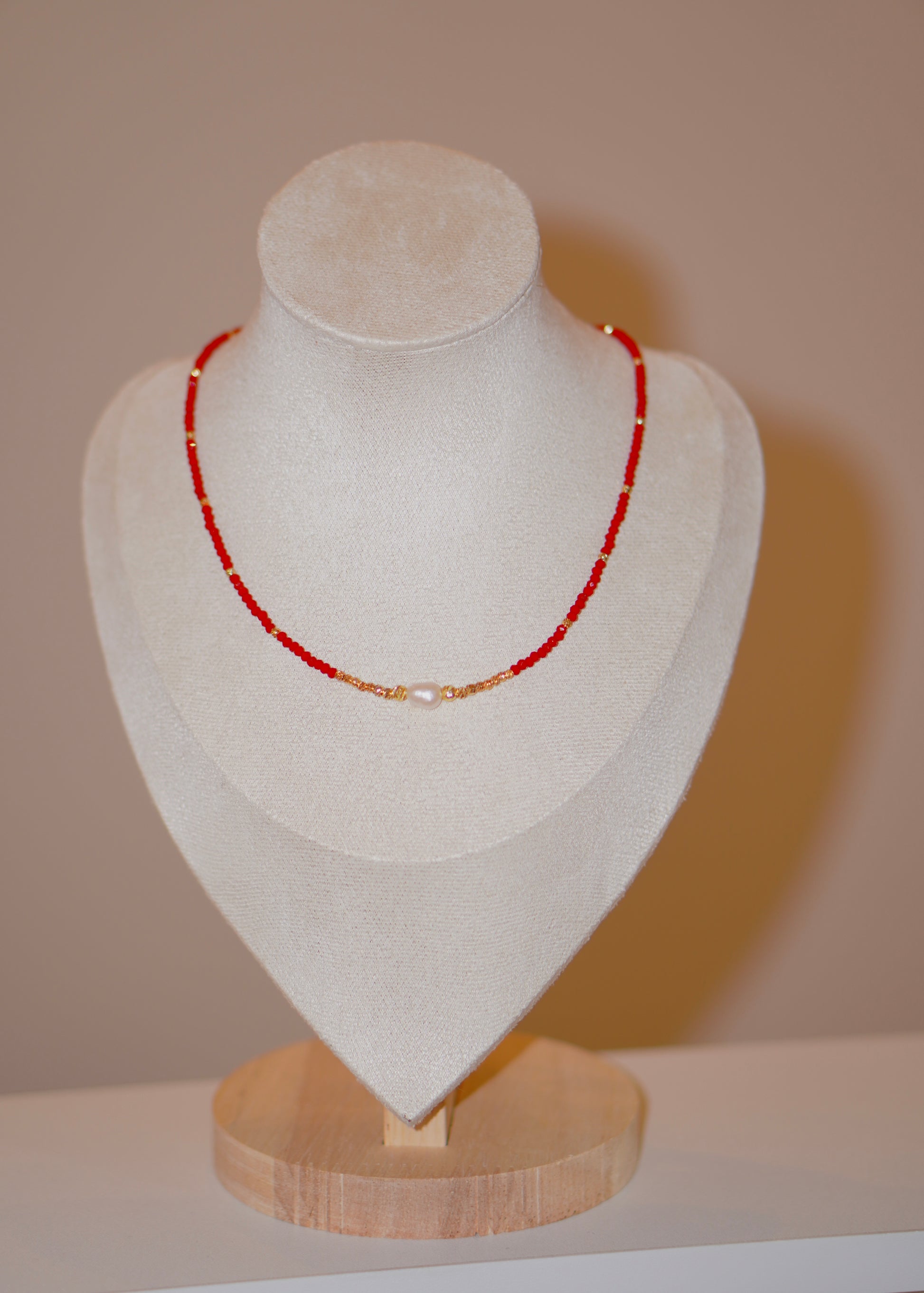 Diese zarte Halskette kombiniert leuchtend rote Glasperlen mit feinen goldenen Elementen und einer einzelnen Süßwasserperle als zentrales Highlight.