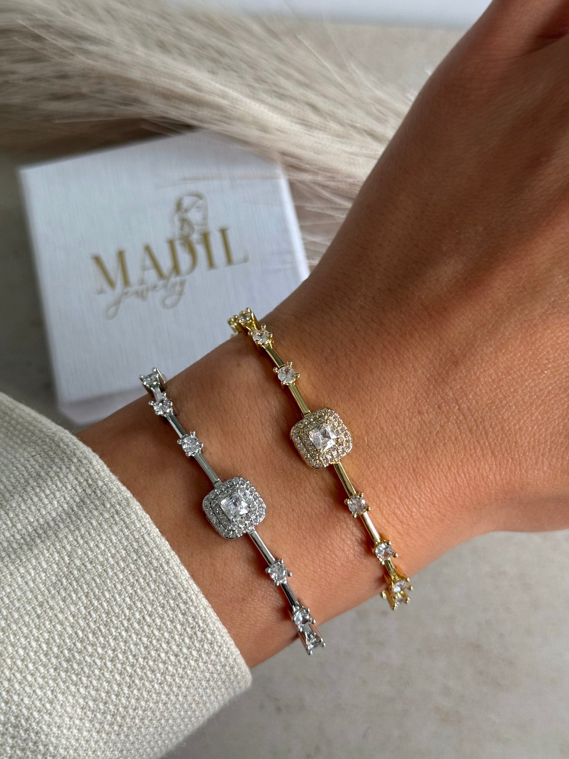 Ein Armband, das sofort ins Auge fällt – quadratischer Zirkonia-Stein, umgeben von feinen Akzenten. Elegant, funkelnd, perfekt für jeden Anlass. ✨