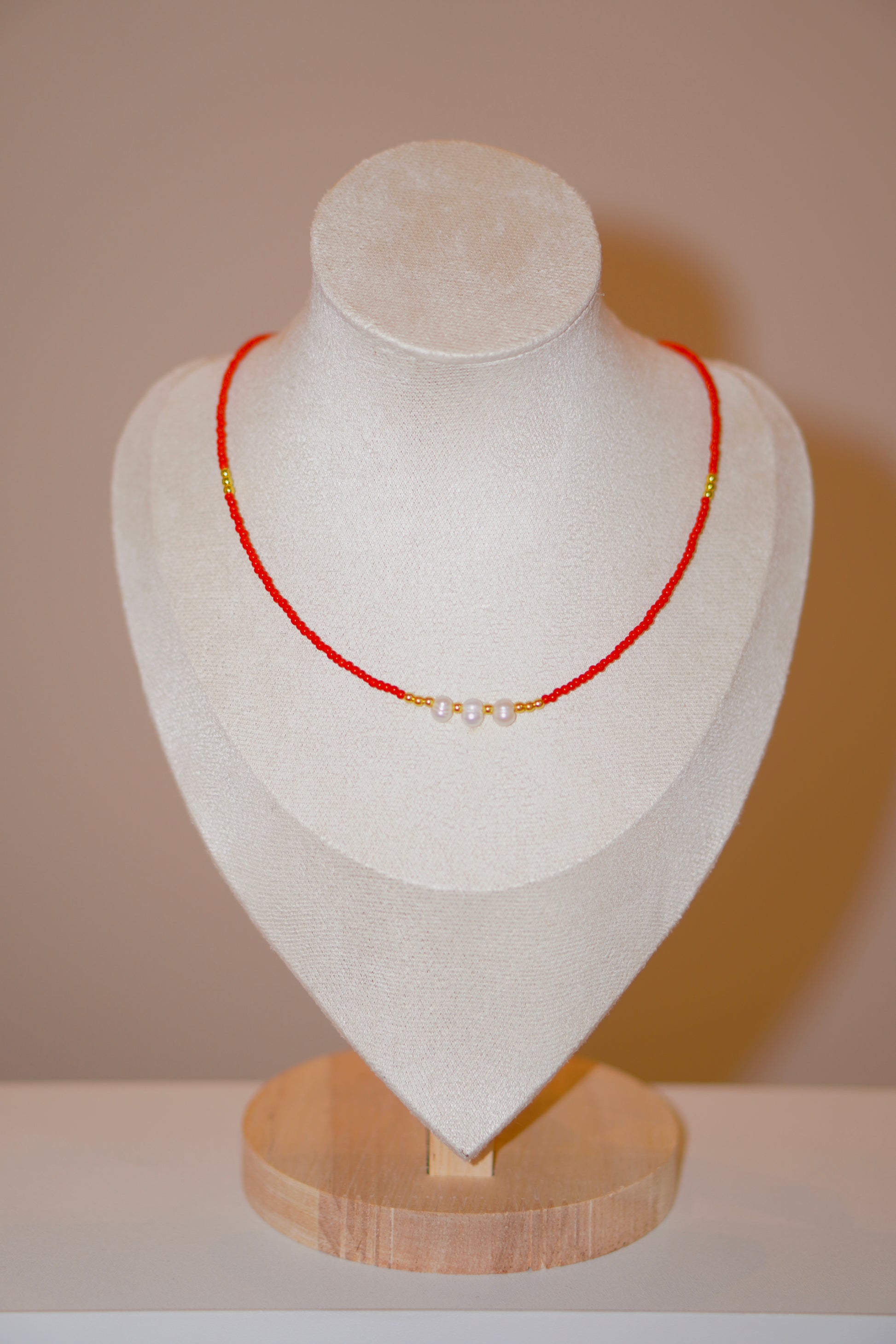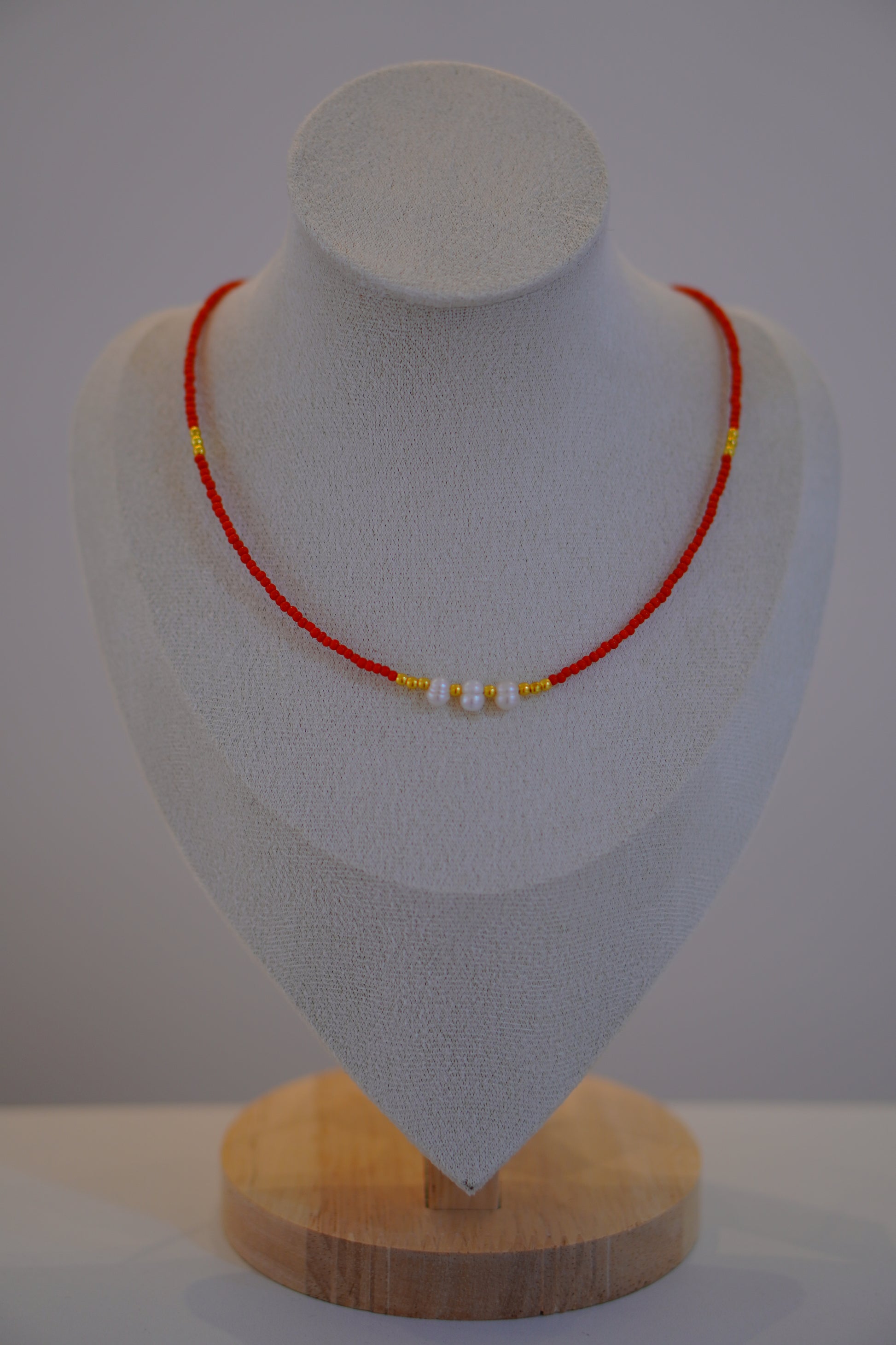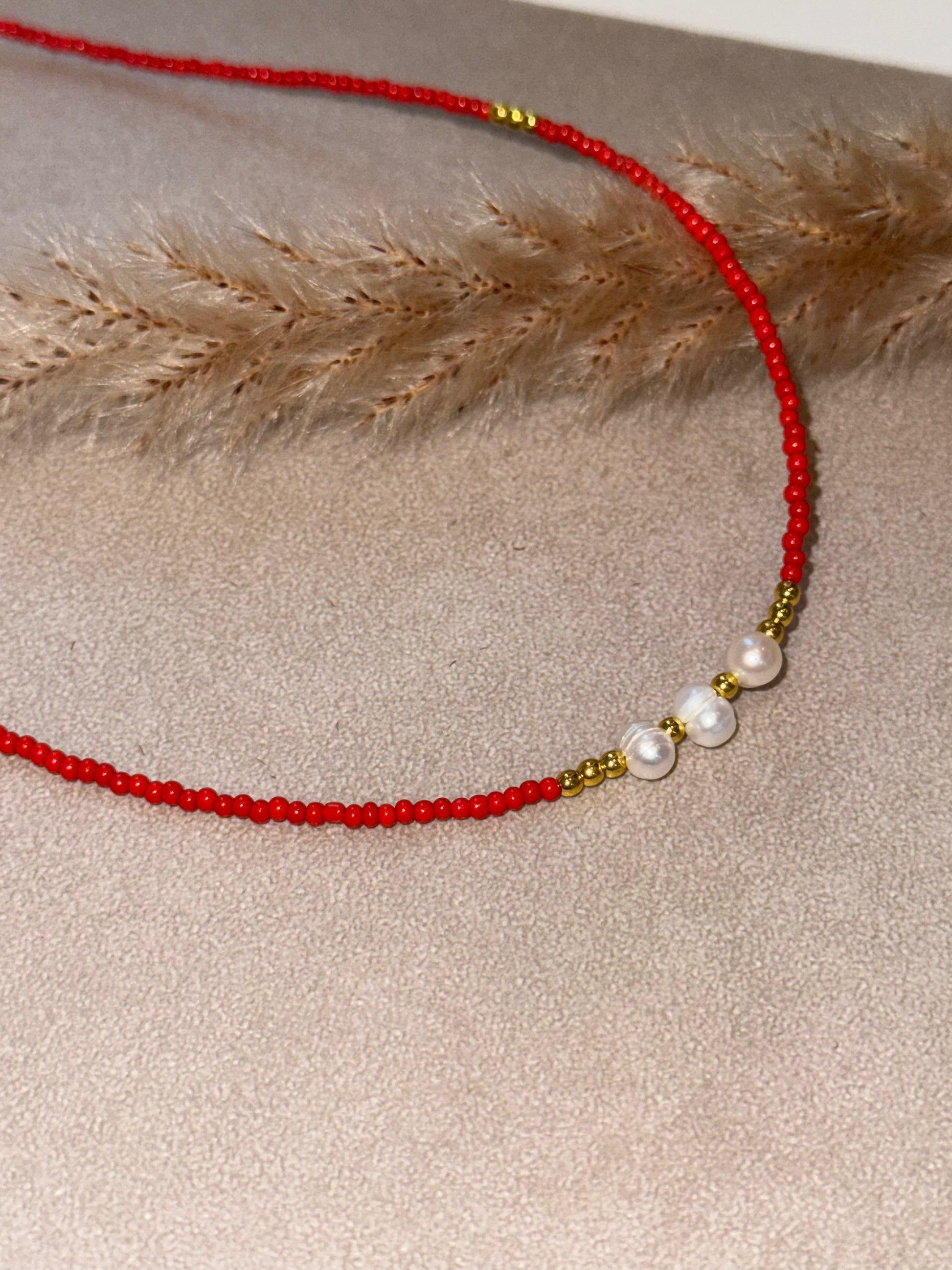 Die Kette besteht aus feinen roten Perlen, goldenen Akzente und drei edle Süßwasserperlen in der Mitte. Perfekt für alle, die ein dezentes, aber auffälliges Statement setzen möchten.